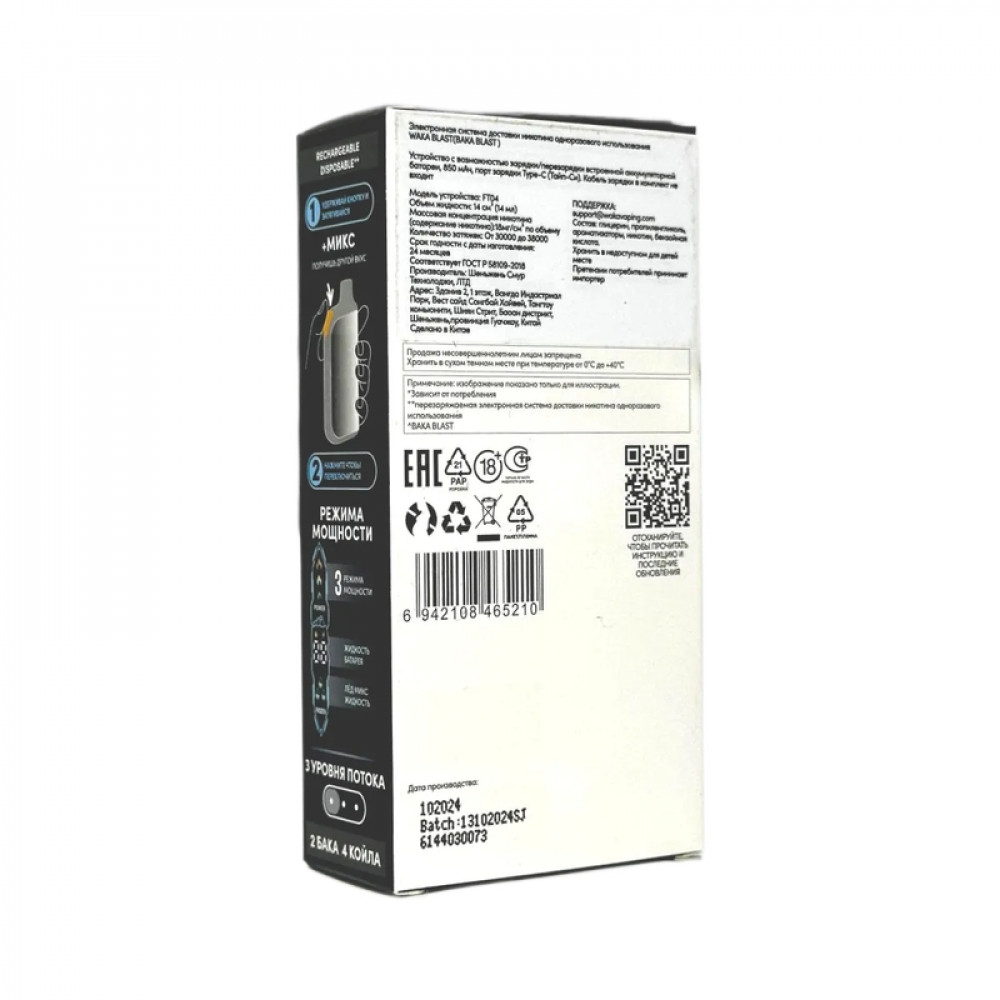 Технические характеристики WAKA BLAST 38000 Hard - Виноградная конфета + лед микс